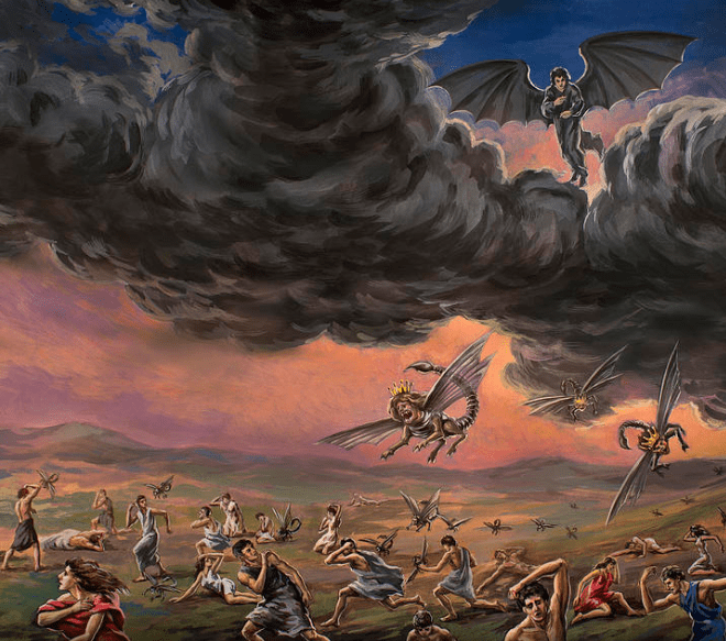 “And the shapes of the locusts were like unto horses prepared for battle; and on their heads were as it were crowns like gold, and their faces were as the faces of men. And they had hair as the hair of women, and their teeth were as the teeth of lions. And they had breastplates, as it were breastplates of iron; and the sound of their wings was as the sound of chariots of many horses running to battle. And they had tails like unto scorpions, and there were stings in their tails; and their power was to hurt men five months. And they had a king over them, who is the angel of the abyss, whose name in the Hebrew tongue is Abaddon, but in the Greek tongue hath his name Apollyon.” – Revelation 9:7-11