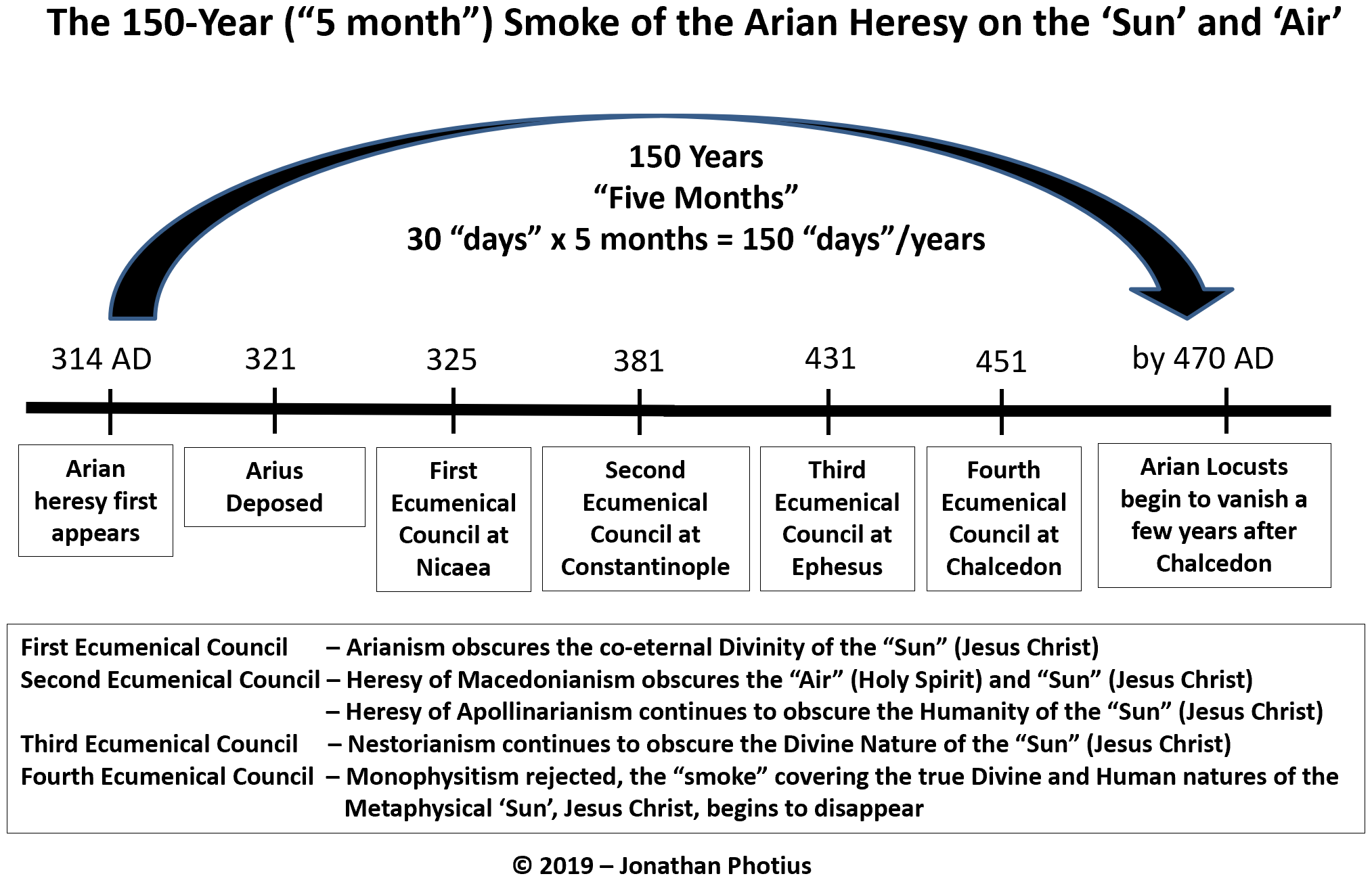 [3] Thus, Makrakis is the first and only historicist commentator on the Apocalypse to point out that the day-year principle of Numbers 14:34 and Ezekiel 4 is fully confirmed in history with the 5 x 30 “days” = 150 years of assault of the Arian Heresy upon the church.