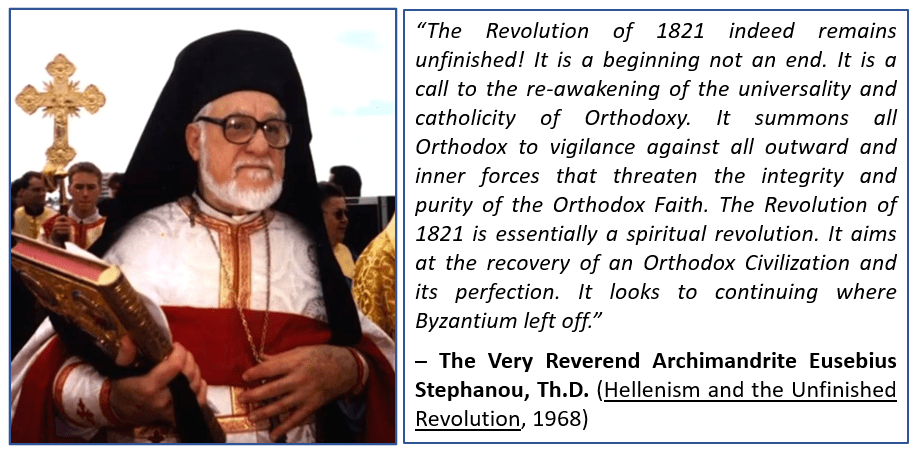 The Revolution of 1821 indeed remains unfinished! It is a beginning -not an end. It is a call to the re-awakening of the universality and catholicity of Orthodoxy. It summons all Orthodox to vigilance against all outward and inner forces that threaten the integrity and purity of the Orthodox Faith. The Revolution of 1821 is essentially a spiritual revolution. It aims at the recovery of an Orthodox Civilization and its perfection. It looks to continuing where Byzantium left off.