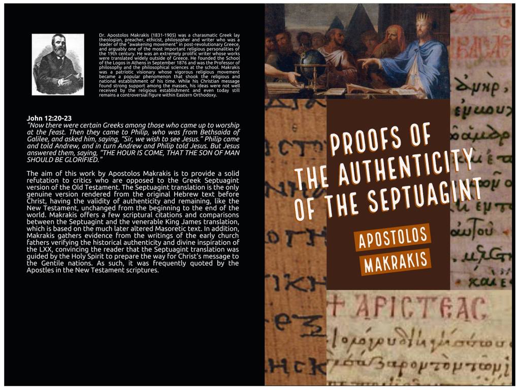 The aim of this work by Apostolos Makrakis is to provide a solid refutation to critics who are opposed to the Greek Septuagint version of the Old Testament. The Septuagint translation is the only genuine version rendered from the original Hebrew text before Christ, having the validity of authenticity and remaining, like the New Testament, unchanged from the beginning to the end of the world. Makrakis offers a few scriptural citations and comparisons between the Septuagint and the venerable King James translation, which is based on the much later altered Masoretic text. In addition, Makrakis gathers evidence from the writings of the early church fathers verifying the historical authenticity and divine inspiration of the LXX, convincing the reader that the Septuagint translation was guided by the Holy Spirit to prepare the way for Christ’s message to the Gentile nations. As such, it was frequently quoted by the Apostles in the New Testament scriptures